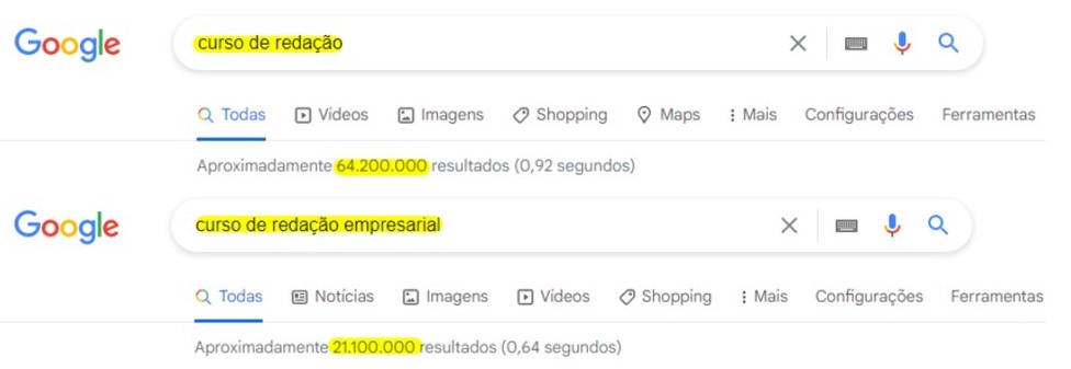 No nosso exemplo, “curso de redação” tem concorrência muito grande, dificultando o bom posicionamento. Com uma pequena variação, especificando ainda mais, como “curso de redação empresarial”, o resultado será melhor. De 64,2 milhões reduziu para 21,1 milhões.